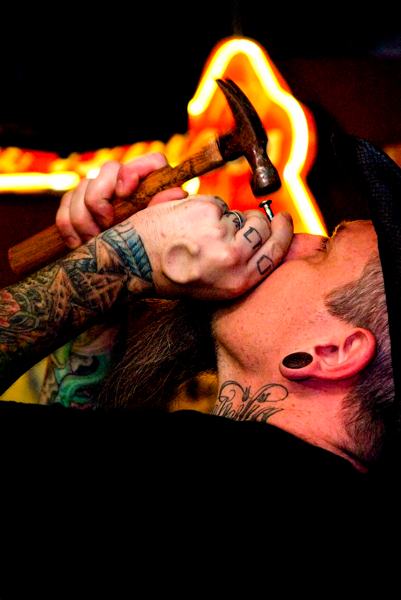 Chris and Elaina met 13 years ago, and maintained a friendship that eventually evolved into a partnership that includes two children, a happy marriage of five years, a home in Douglasville, snakes, swords, hammers and more. They consider each to be the other’s best friend and every night, after the girls have gone to bed, work on their acts.